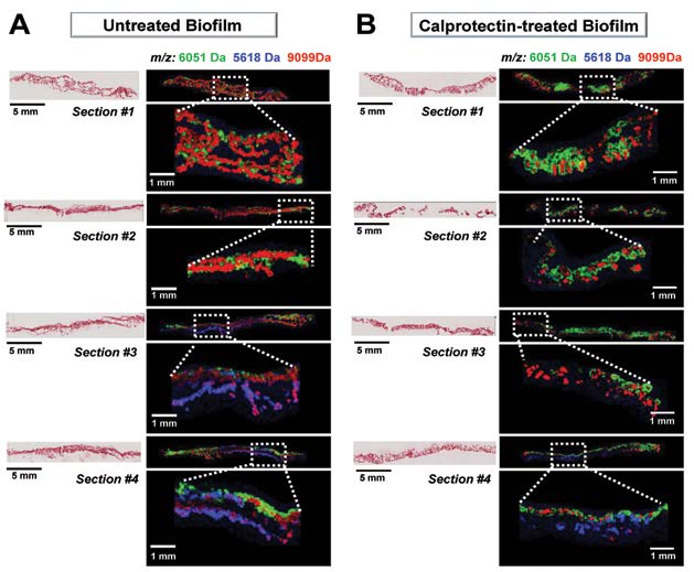 Figure 4. Four different cross-sections of Pseudomonas aeruginosa strain PA14 biofilms, untreated (A) or exposed to calprotectin in the media (B). Gram-Safranin stained images (post-analysis) are presented on the left, and MALDI MSI signals with differential biofilm localization are shown on the right. Overlay: m/z 6051 (green), m/z 5618 (blue), m/z 9099 (red). MALDI images collected at 50 µm, 66,571 pixels.